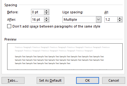 - Adjust the "Line Spacing" to "Multiple" and set it to 1.2. This works well for most common font sizes.