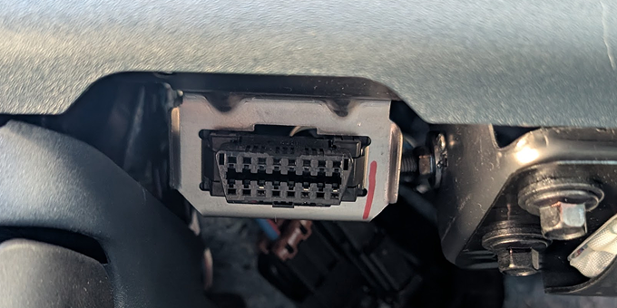 The OBD-II port is typically found beneath the dashboard, near the driver's side footwell, usually under the steering wheel or near the pedals. You're looking for a large 16-pin connector.